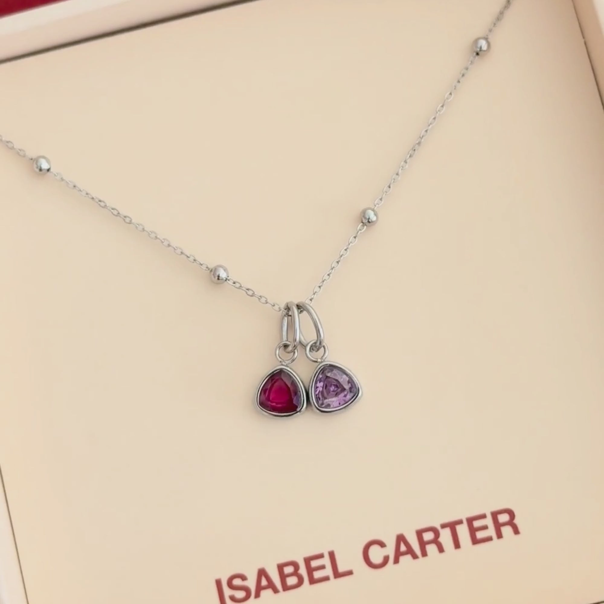 Two-stone silver birthstone necklace for connected moments—partners, children, or two months that matter. A balanced, meaningful pendant that layers elegantly and makes a deeply personal gift.
