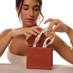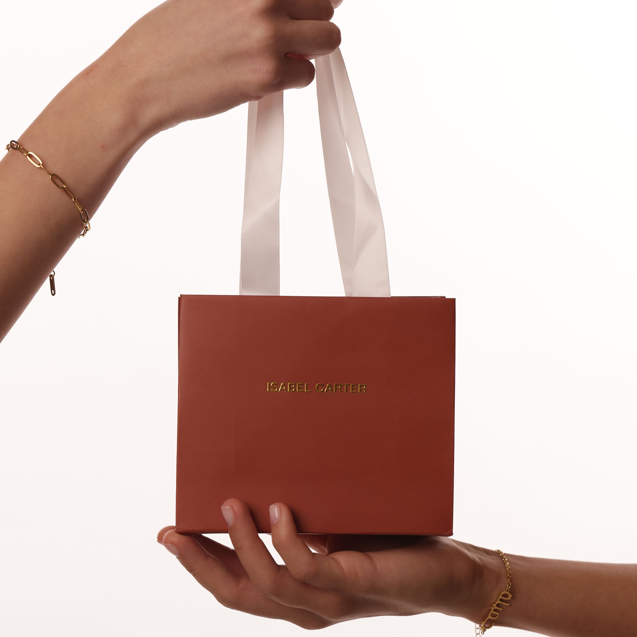 A refined finishing touch for jewellery gifts, crafted in our signature Terracota Brown with a softly lustrous feel. Silk ribbon handles and an embossed gold logo add quiet elegance from first glance to final reveal.
